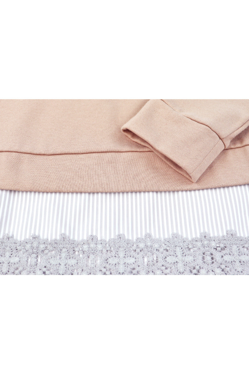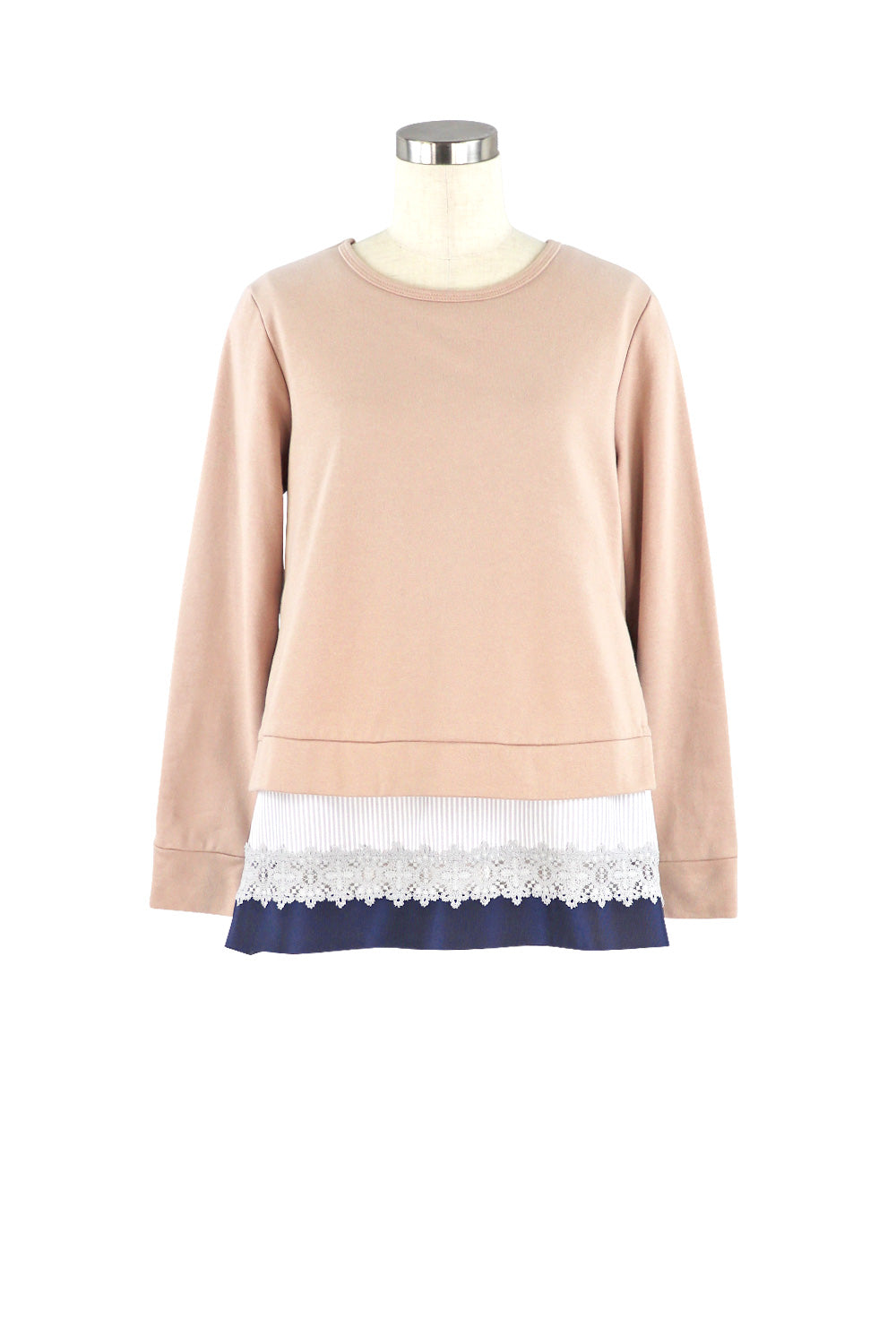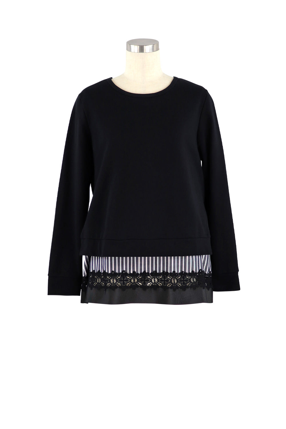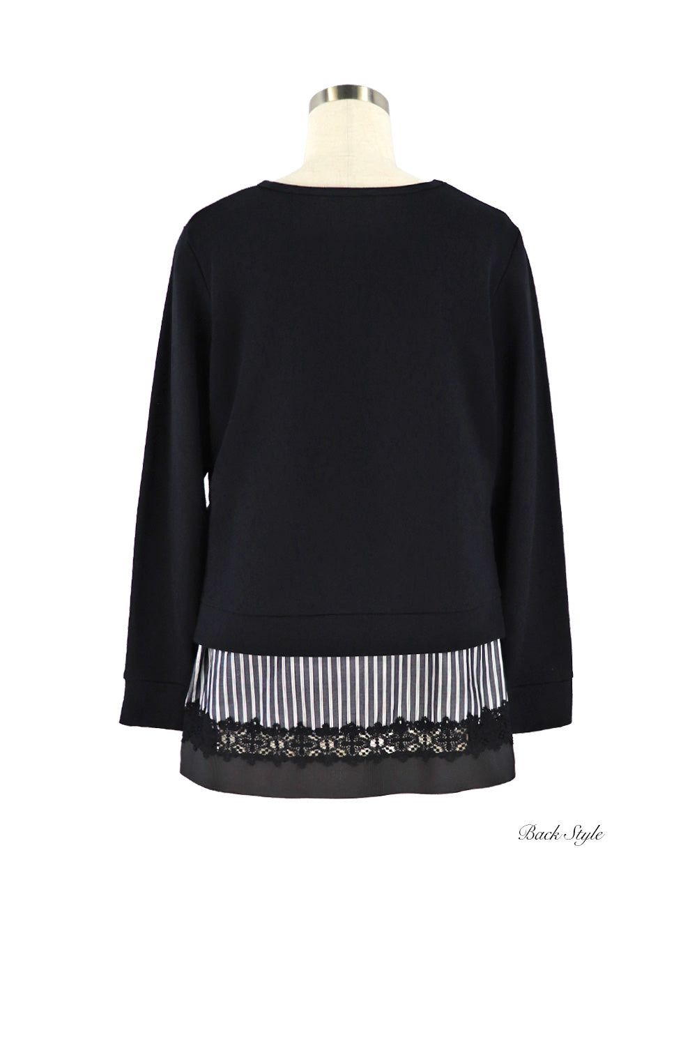 ミニ裏毛のスウェット生地とストライプのブロード生地を組み合わせ、まるでシャツとレイヤードしているかのようなデザインのトップスは、異素材ミックスでおしゃれ映えして1着でスタイリングを完成させてくれる魅力的なデザイン。
