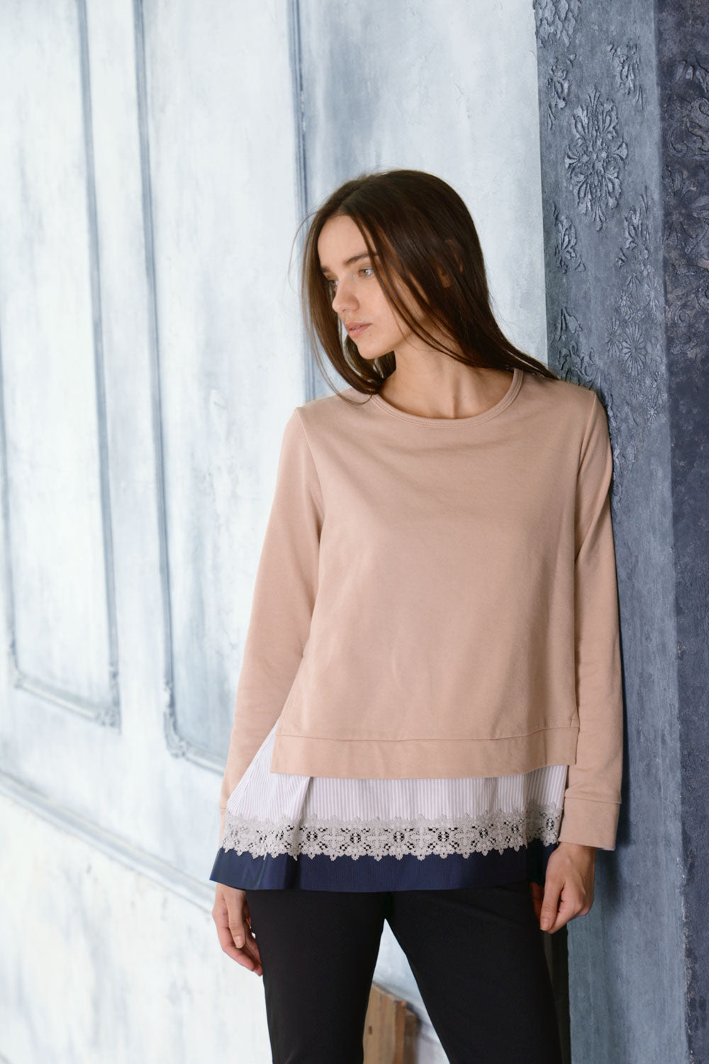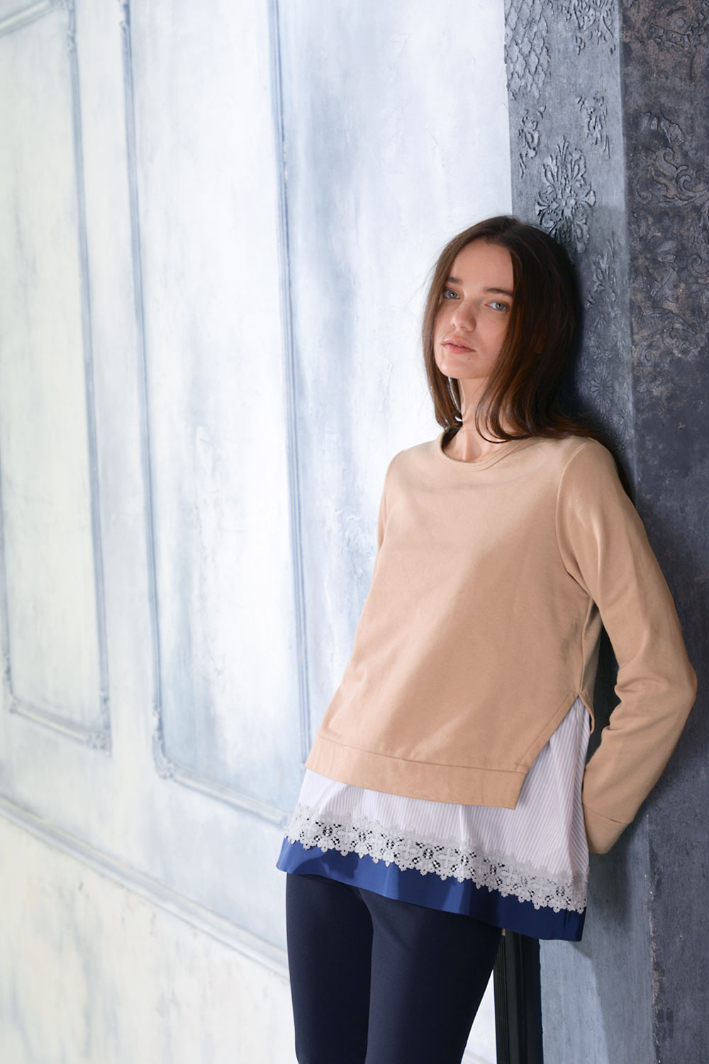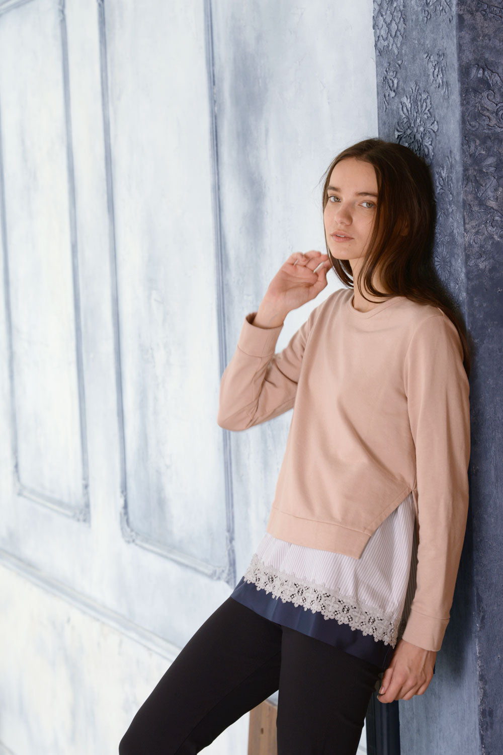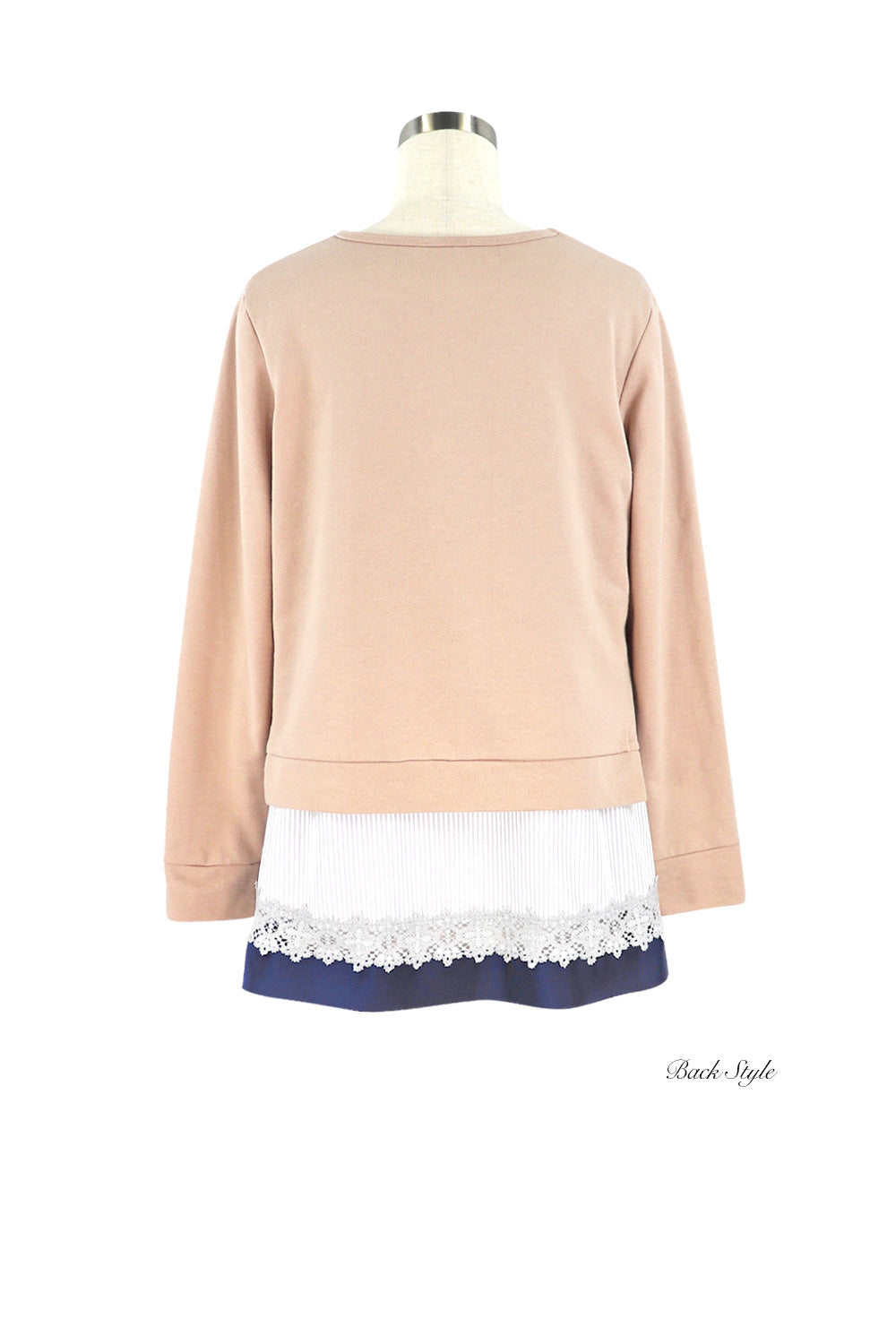 ミニ裏毛のスウェット生地とストライプのブロード生地を組み合わせ、まるでシャツとレイヤードしているかのようなデザインのトップスは、異素材ミックスでおしゃれ映えして1着でスタイリングを完成させてくれる魅力的なデザイン。