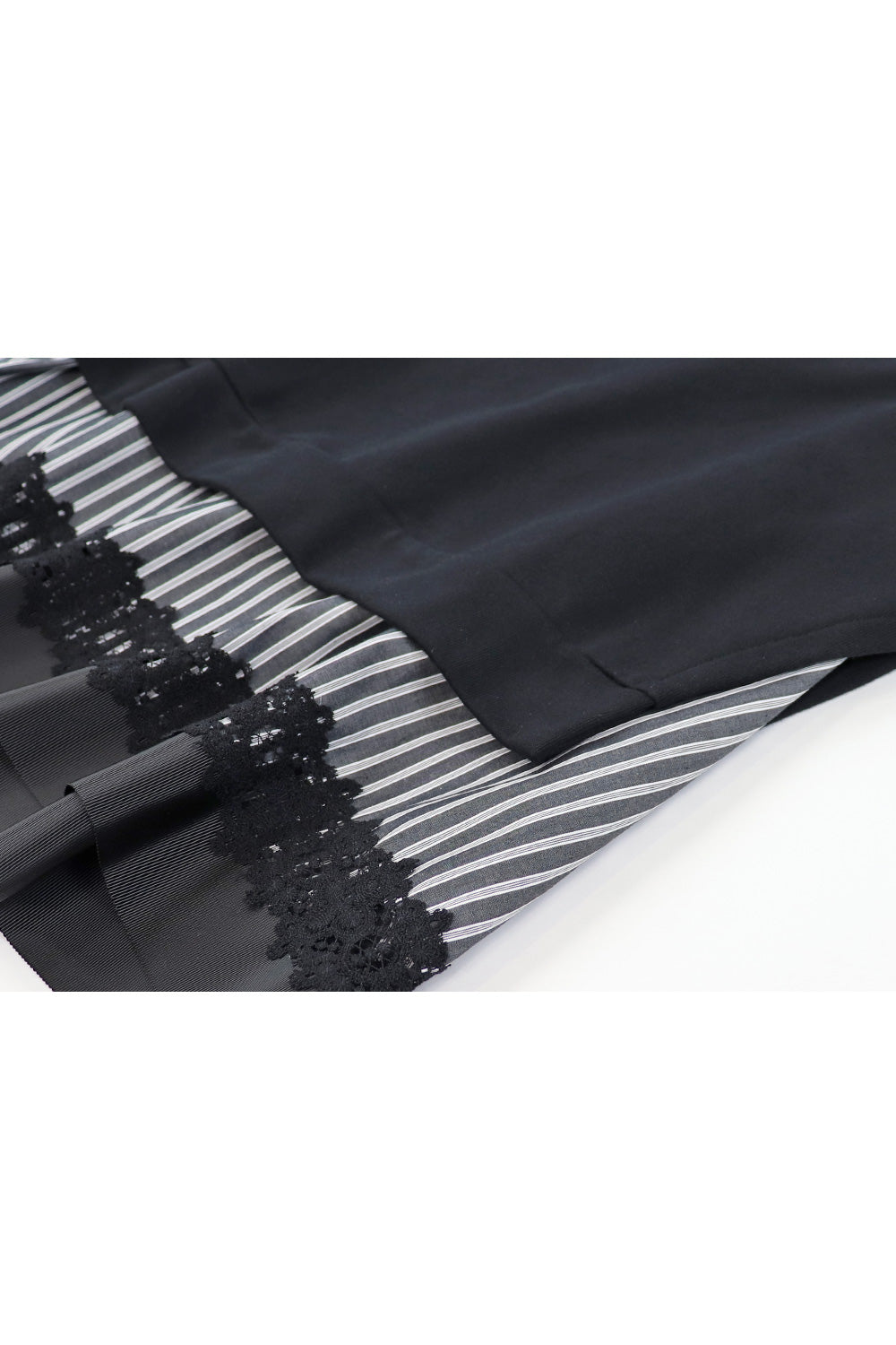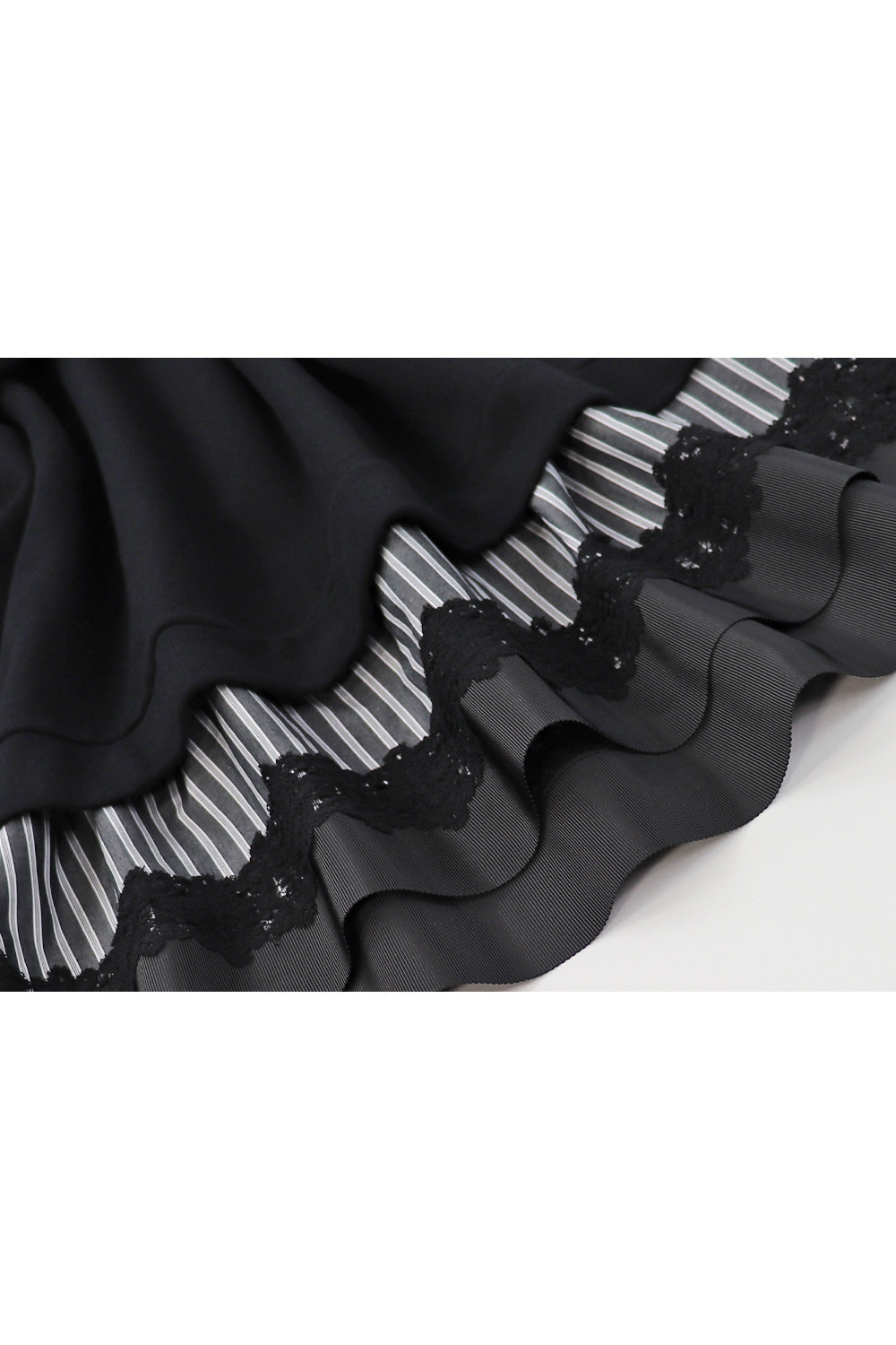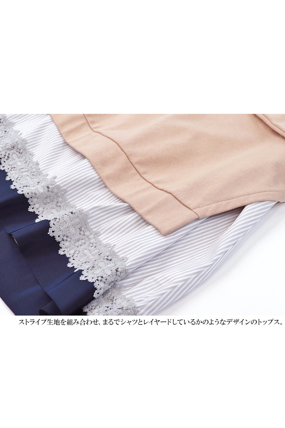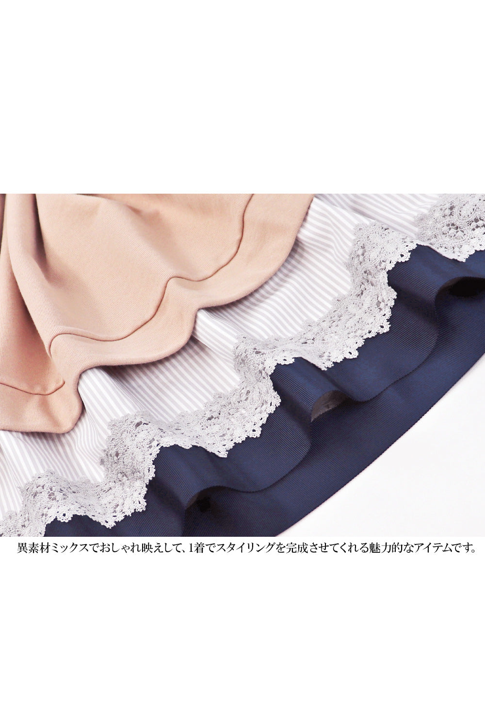 サイドスリットの入ったコンパクトな丈感の本体は、ストレッチ性があり柔らかで肌触りが良いコットン100%のミニ裏毛。そして、華やかなコットンレースを裾にのせたストライプ生地は、シルキータッチな滑らかさと微光沢で高級感のあるコットン100%のブロード生地を使用。裏生地でストライプ生地を吊った身頃部分は2重構造で、ウエストやヒップをふんわりと包み女性らしさを引き立てるAラインシルエットをキープ。細めのパンツからストレート、デニム、ワイドパンツなど、幅広くスタイリングを楽しんでいただけます。