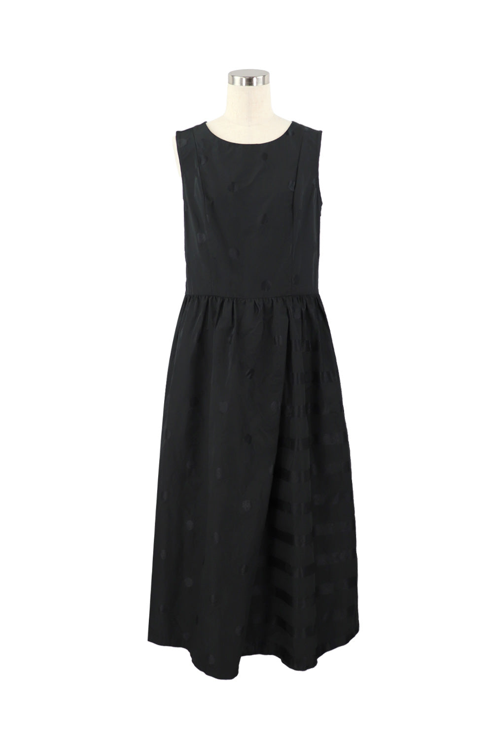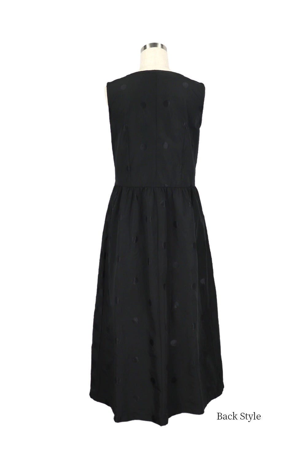 ウエスト切り替えのギャザーで、スカートは控えめに優雅なフレアラインを描いています。脇にはめ込んだ同生地のボーダードット柄が遊び心のあるおしゃれなデザインポイント。