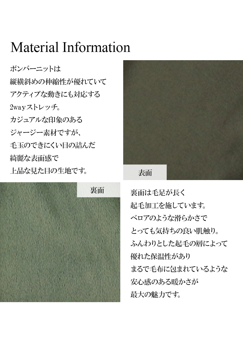 襟と裾はモコモコボアの癒し系素材。身頃は裏起毛のボンバーニット素材。両素材共に伸縮性がよく、優れた保温性と裏起毛の気持ちの良い肌触りが魅力。着た瞬間から温かさが実感でき、防寒しつつデイリーウェアとして活躍してくれます。
